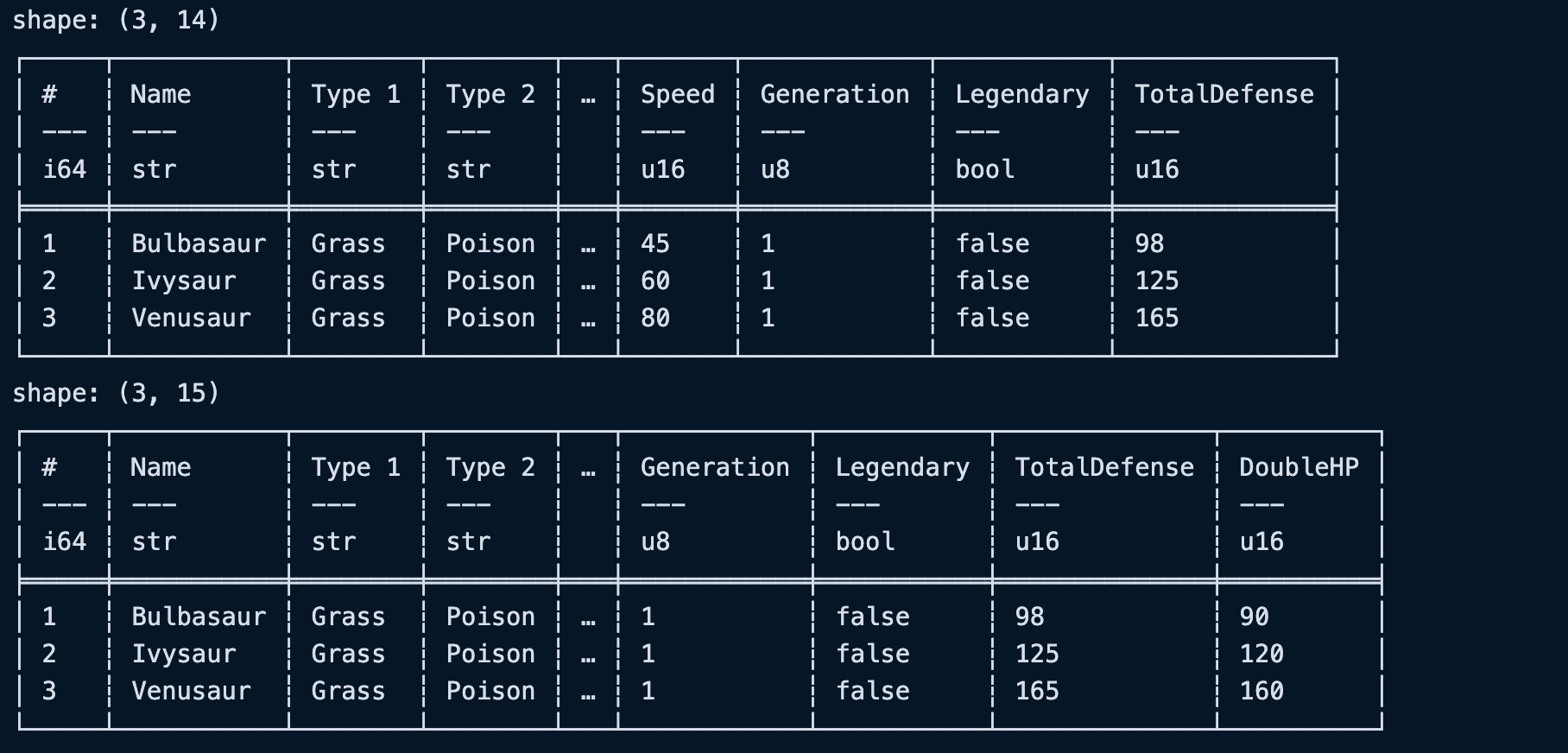 (pl.col("Attack") + pl.col("Defense")).alias("TotalDefense")