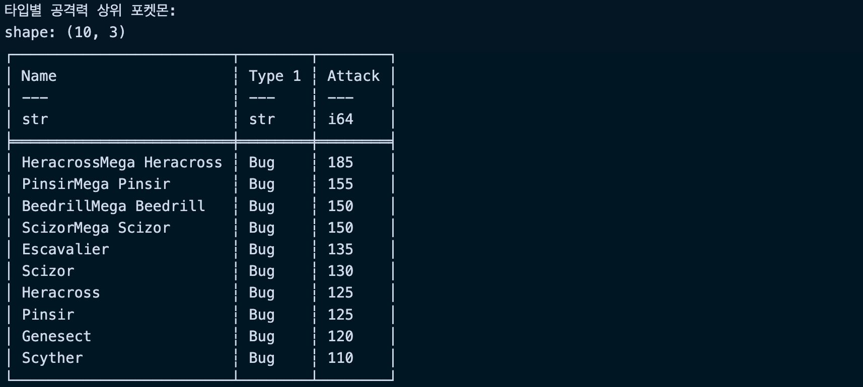 print(type_attack_sorted.select(["Name", "Type 1", "Attack"]).head(10))