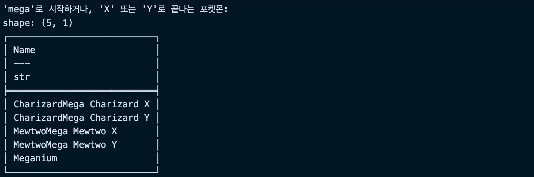 print("\n'mega'로 시작하거나, 'X' 또는 'Y'로 끝나는 포켓몬:")