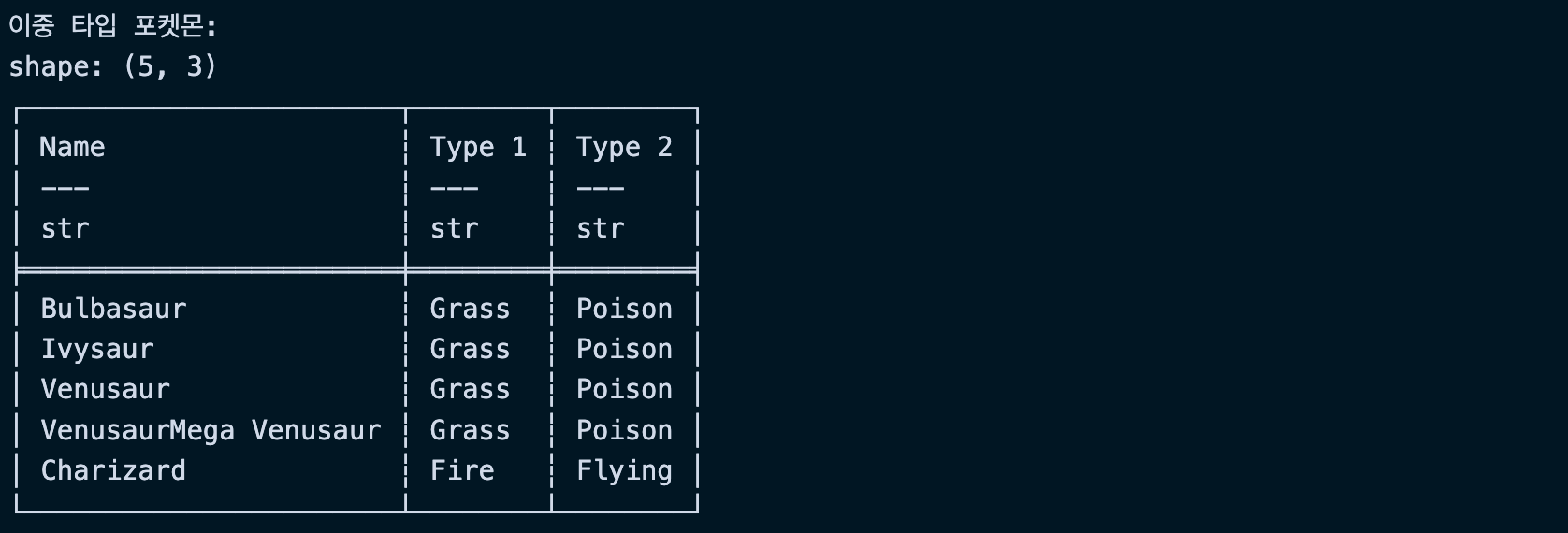 print(dual_type.select(["Name", "Type 1", "Type 2"]).head())