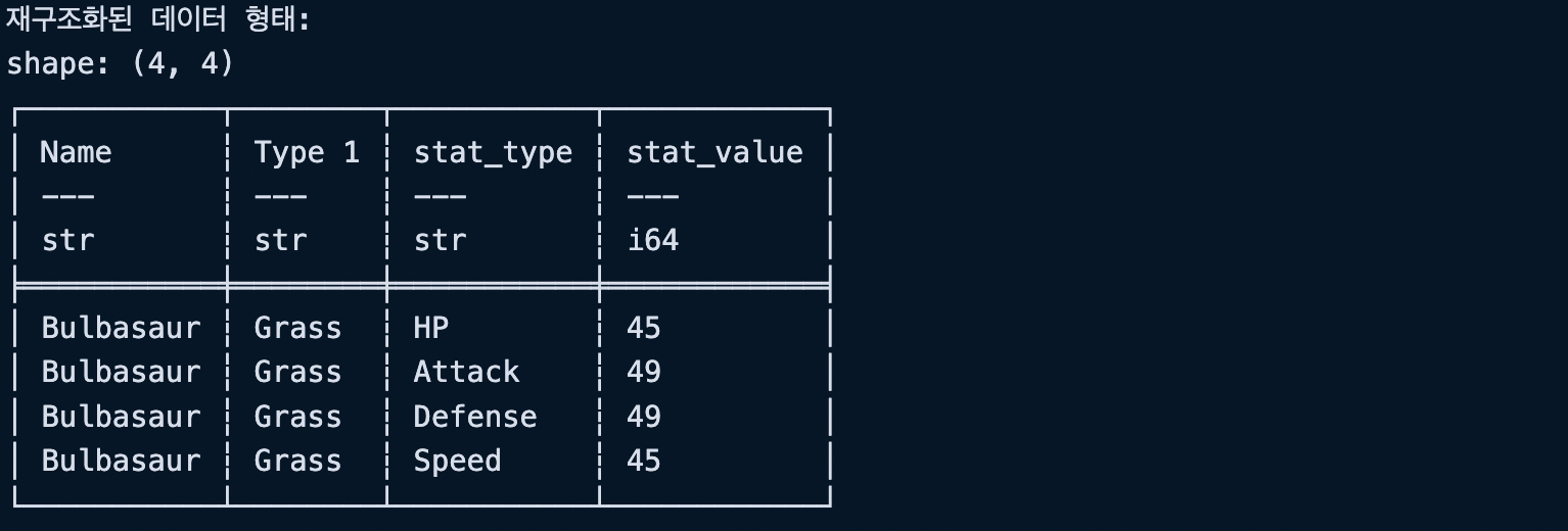 print(unpivoted_stats.filter(pl.col("Name") == "Bulbasaur"))