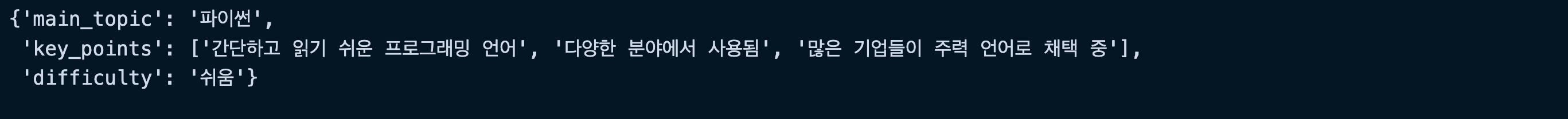 - 자연어 응답을 JSON, 딕셔너리, Pydantic Model 등 구조화된 형식으로 변환