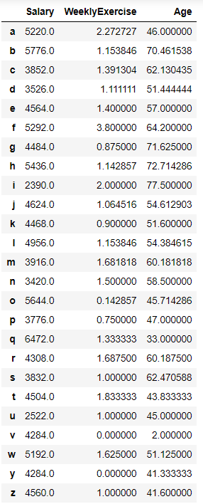 df.groupby(groupby_alphabet)[["Salary", "WeeklyExercise", "Age"]].mean()