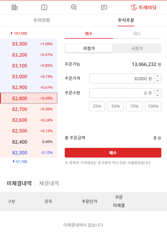 트레이딩 탭에서 주식주문 탭을 클릭하면 주식을 주문할 수 있습니다. 장중에만 주문할 수 있으며, 실시간으로 주문이 체결됩니다. 지정가 주문, 시장가주문 등 매매를 위해 필요한 기능을 모두 제공하며, 아래 미체결내역, 체결내역에서 주문 결과를 확인할 수 있습니다.