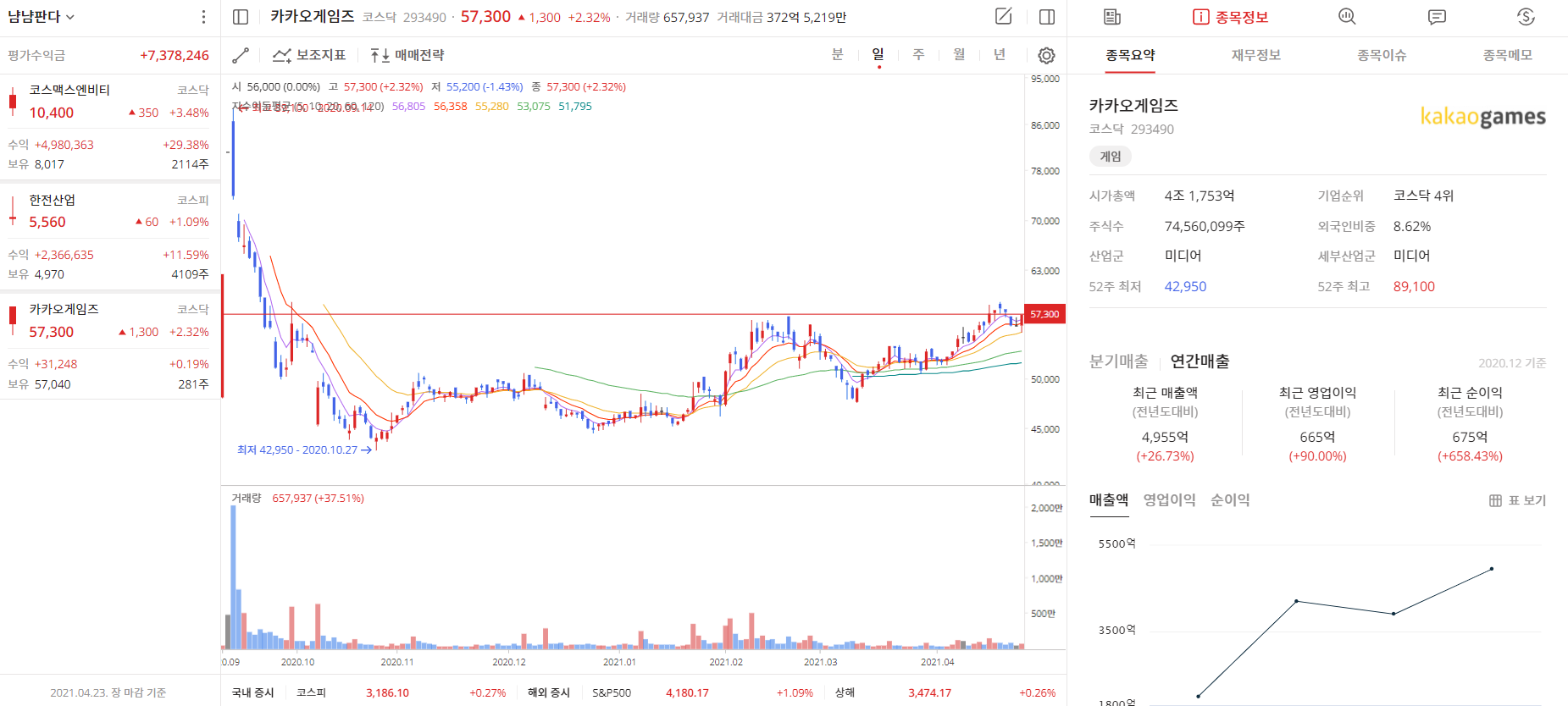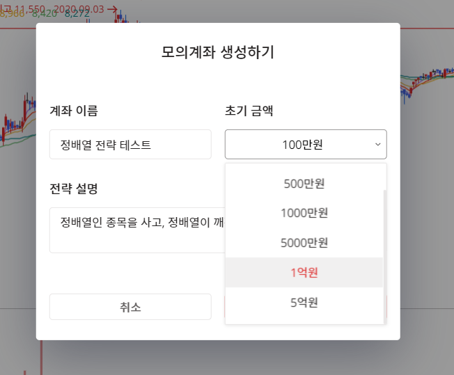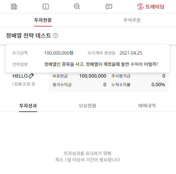 계좌 이름과 설명, 초기 금액을 설정하면 모의계좌가 만들어지고, 모의투자를 시작할 수 있습니다. (참 쉽죠?)