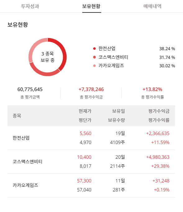 보유현황 탭에서는 현재 자신이 보유하고 있는 종목들의 보유비중과, 각 종목들에 대한 평가수익률 등을 확인할 수 있습니다. 매매내역 탭에서는 체결내역과 과거 본인이 매매했던 내역을 확인할 수 있습니다.