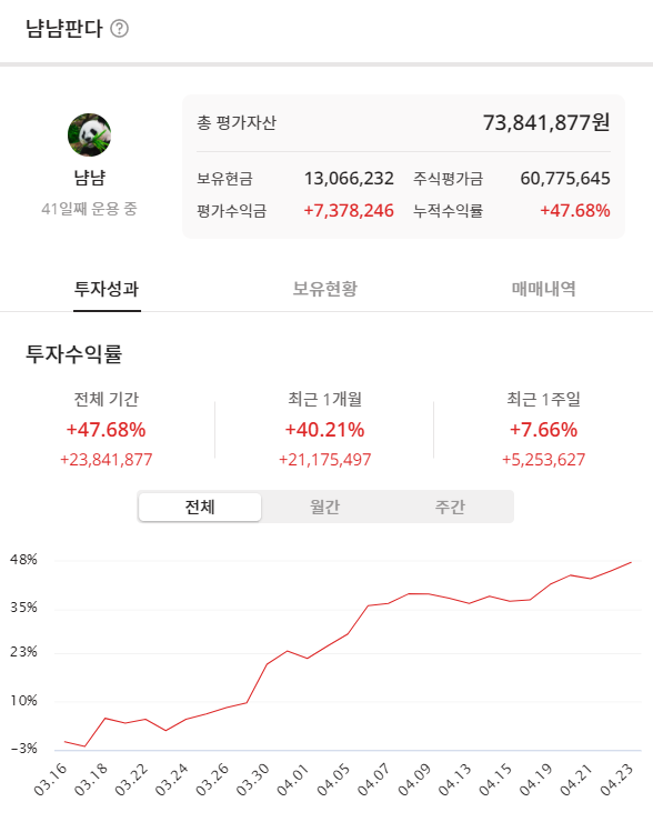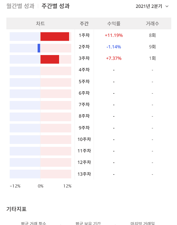 투자현황탭의 투자성과 탭에서는 모의계좌의 누적 수익률과 기간별 수익률을 제공해줍니다. 투자수익률 그래프를 통해서 본인의 수익률을 시각적으로 확인할 수 있고, 본인의 실력과 전략을 검증해볼 수 있습니다. 또한 월간 별 성과, 주간 별 성과를 통해서 월간, 주간별 본인의 수익률과 승률을 가늠해볼 수 있습니다.