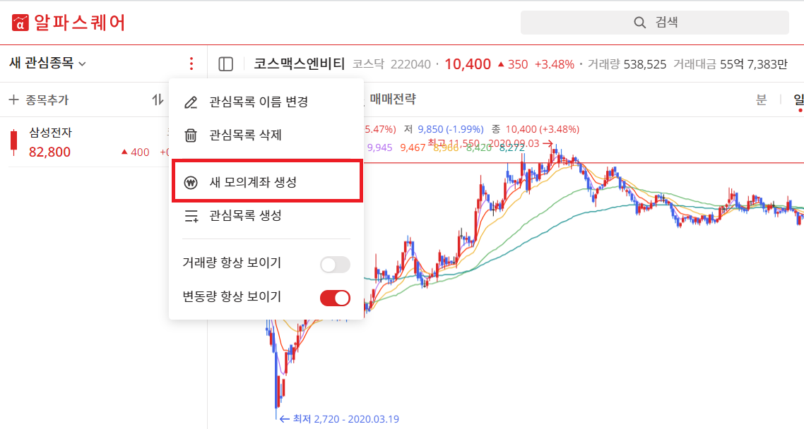 우선 왼쪽 관심목록의 메뉴를 클릭하여 새 모의계좌 생성을 눌러줍니다.