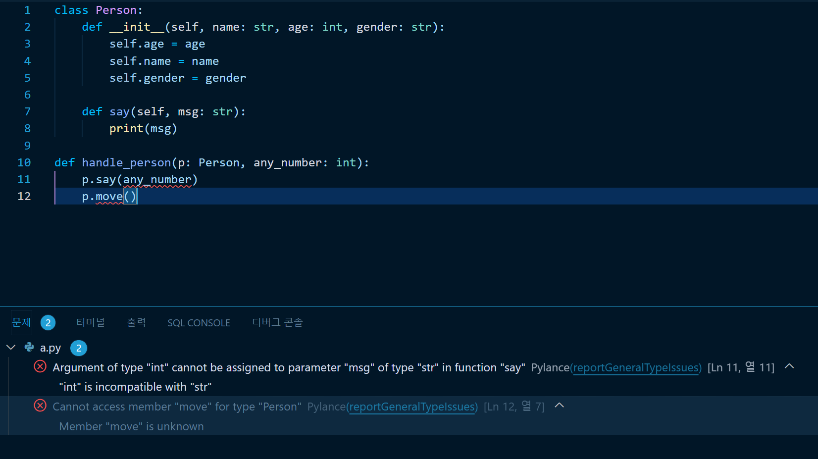 - vscode와 같은 에디터를 사용하면 코드를 작성하면서 잘못된 타입에 대한 피드백을 즉각적으로 받을 수 있습니다. (vscode settings.json에 "python.analysis.typeCheckingMode": "basic" 추가)