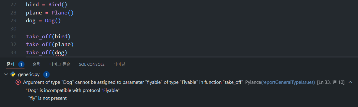위의 코드와 같이 Flyable 프로토콜(인터페이스)을 정의합니다. 특정 객체가 fly메소드를 가지고 있다면 해당 프로토콜을 만족하는 것이고, take_off 함수의 인자로 사용될 수 있습니다. 만약 fly 메소드를 가지고 있지 않다면 타입 검사에 실패합니다.