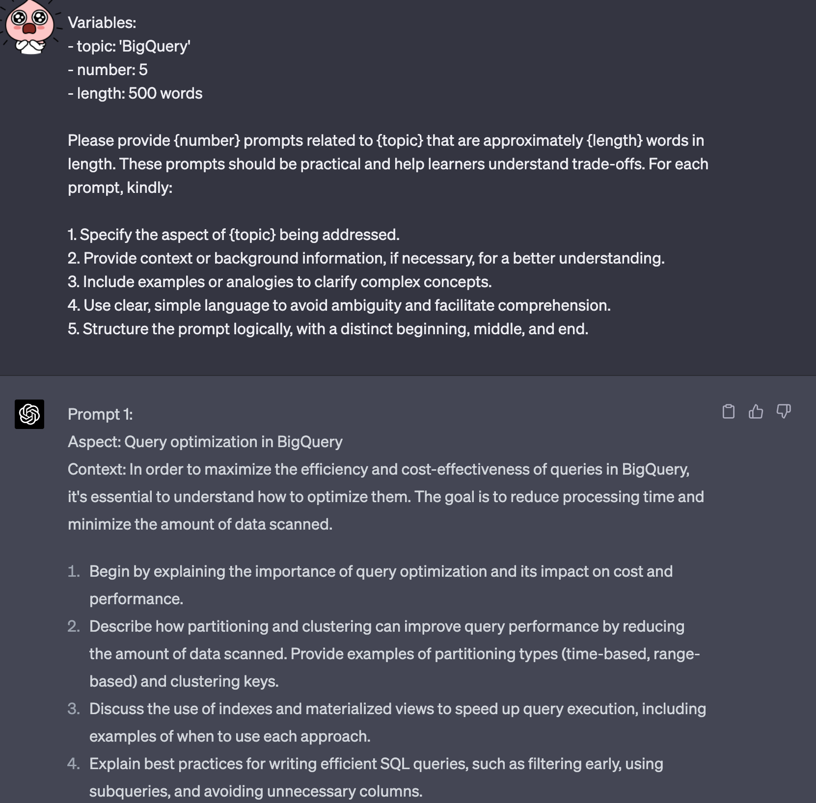 결국 좋은 질문을 만들 수 있어야, 좋은 답변을 얻을 수 있다. 문맥을 부여해서 구체적으로 질문할 수 있어야 하고, 재사용 가능한 프롬프트를 만들기 위해 필요한 부분을 변수화 할 수 있어야 한다. 이런 질문을 하기 위해서는 내가 질문하고자 하는 분야에 대한 배경지식이 있어야 한다. 배경지식이 없는 분야에서 좋은 질문을 하기란 매우 힘들다. 하지만, 질문을 하기 위해 전문가 수준의 지식이 필요한 것은 아니다. 해당 분야에 대한 기본적인 지식이나 용어만 아는 것으로 충분할 수 있다. 그리고, GPT와 함께 배경지식을 늘려갈 수도 있다. GPT에게 특정 분야에 관해 질문을 잘하기 위한 배경지식이나 용어등을 알려달라고 해보자!