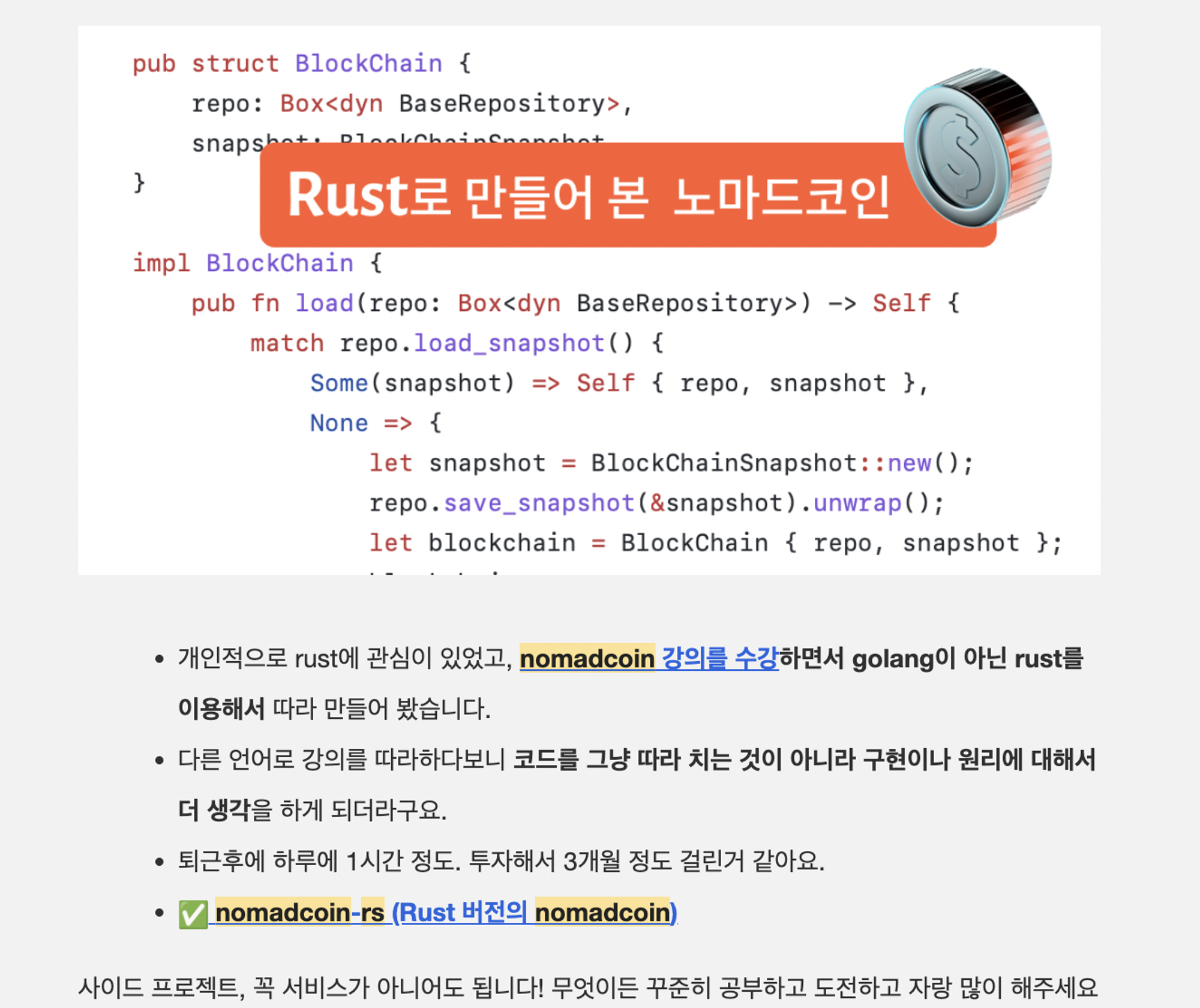 안녕하세요, 오늘은 제가 2년 전에 했던 사이드 프로젝트 'nomadcoin-rs' 경험을 소개해 볼까 합니다. 작업한 지 2년도 더 된 프로젝트이지만 블로그에서 한 번도 다뤄본 적이 없어 다루어 보려고 합니다. 해당 프로젝트는 '노마드 코인: Go로 암호화폐 만들기'라는 노마드 코더의 온라인 강의를 Rust로 클론 코딩하는 프로젝트였습니다. 해당 프로젝트의 메인 언어는 golang이었지만 Rust에 대한 관심이 높았고, 막 공식 문서 공부를 끝낸 참이어서 언어에 좀 더 익숙해지기 위해 Rust로 프로젝트를 진행하기로 결심했습니다.