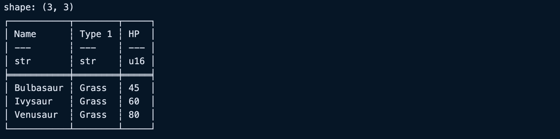df_selected = df.select(["Name", "Type 1", "HP"])