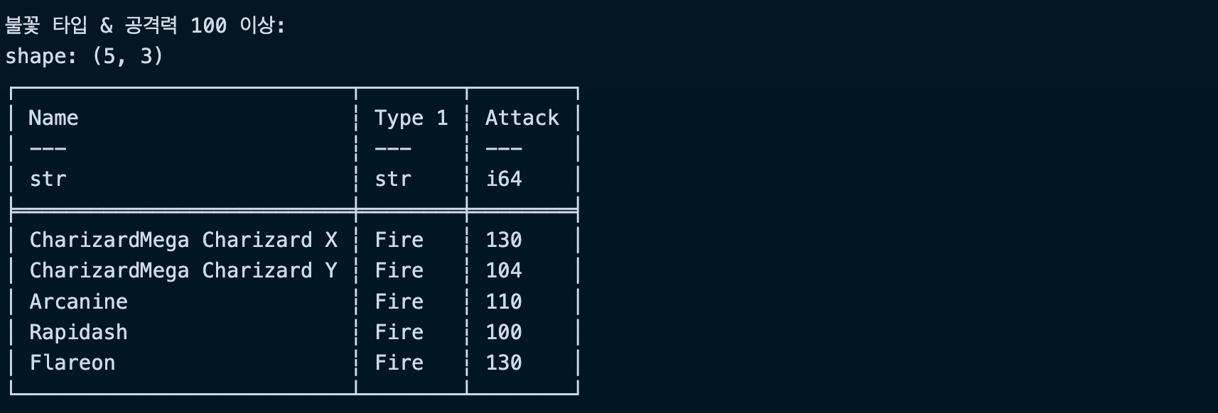 print("\n불꽃 타입 & 공격력 100 이상:")